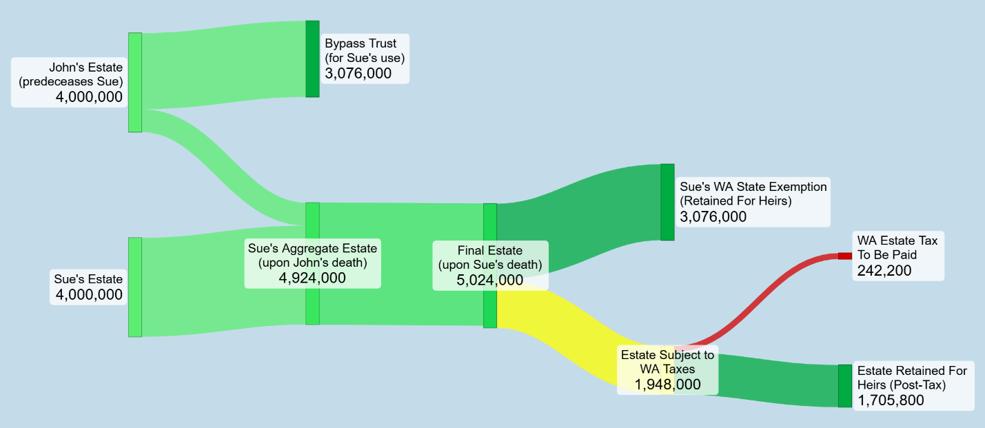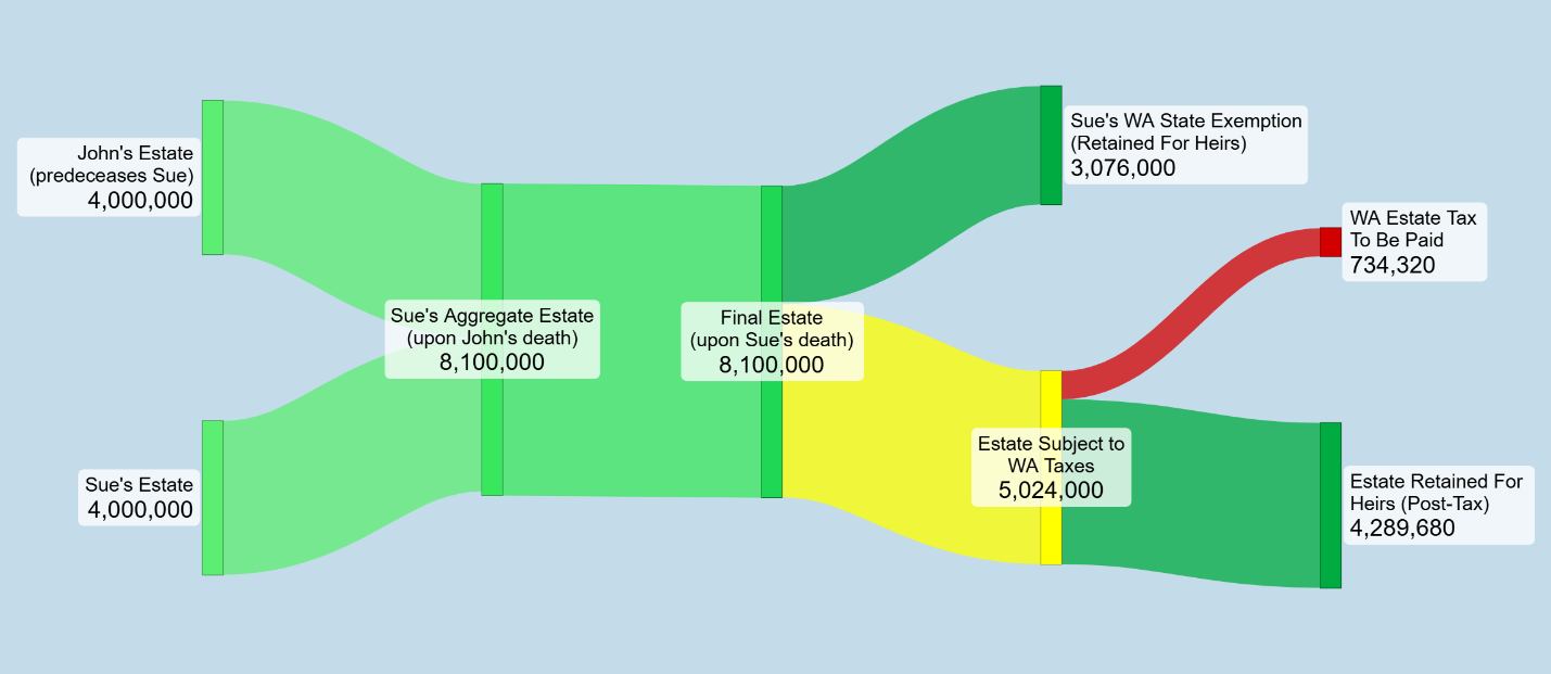 Ignoring the costs of probate and other estate administration fees, this leaves $7,857,800 of the estate to be retained for heirs and/or other purposes ($3,076,000 B-Trust + $3,076,000 of Sue’s WA exemption + $1,705,800 of estate retained after WA estate taxes are applied).